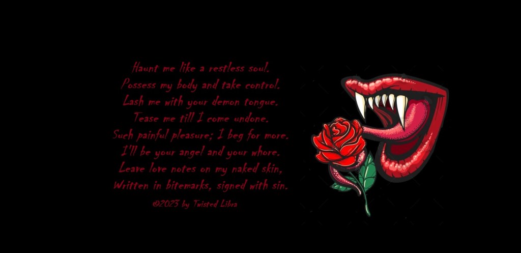 Wicked little things… Posted byTwisted LibraFebruary 12, 2023February 12, 2023Posted inPoetryTags:author, bite, blog, cemetery, dark, death, erotic poetry, grave, graveyard, libra, Poetry, romance, self-published, vampire, writer I made this for you, my lovelies. Enjoy! Until next time… Tell your friends: Click to email a link to a friend (Opens in new window) Email Share on TumblrTweet Click to share on Threads (Opens in new window) Threads Click to print (Opens in new window) Print More Click to share on Reddit (Opens in new window) Reddit Pocket Click to share on Telegram (Opens in new window) Telegram Click to share on WhatsApp (Opens in new window) WhatsApp Like Loading... Related Published by Twisted Libra Creator of the Twisted Libra Cemetery, and lover of all things macabre! View more posts